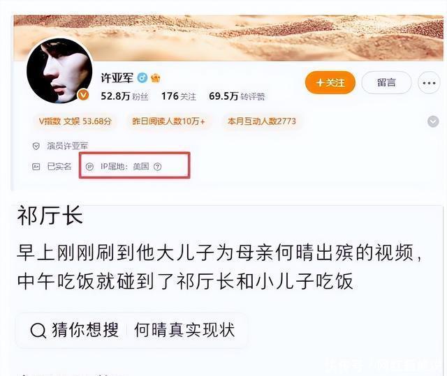照片显示,许亚军身穿白色休闲装,戴着金丝眼镜,正专注看手机,身旁坐着的是他与现任妻子张澍所生的小儿子。 IP地址显示在美国的社交账号动态,似乎佐证了这一点,当这个信息一经曝光之后,舆论迅速发酵。